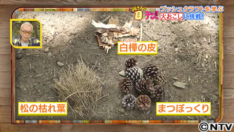 いよいよ火を起こし、料理に挑戦します!金丸さん、火を起こすための薪となる枝を集めに、再び探索。見つけたのは、火おこしに適した白樺の木。木の皮を早速集めていきます。他にも大量のまつぼっくりや、松の枯れ葉をゲット!さらに、薪になる枯れ枝を手に入れます。