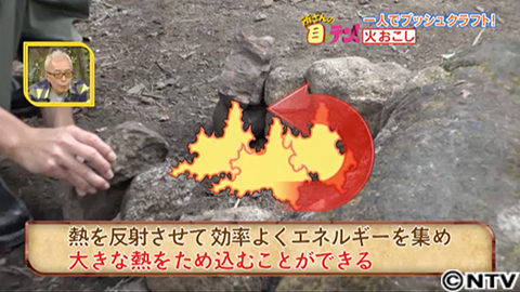 岩と石を使い、かまどを作っていきます。実はこれ、石の壁があることで、熱を反射させて逃がさないようにする効果があるのです。そうすることで、火の熱を無駄にしないため、薪の消費を減らすことができるのです。