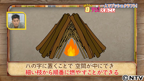 川口さんに、整理が大事だと教わっていた金丸さん。薪となる枯れ枝を、細い順に分けていきます。実は、薪の太さを分けることで、効率的に燃える焚き火を組むことができるんです。細い枯れ枝から、順番にハの字に置くことで、燃えやすい空間が中にでき、細い枝から順番に燃えていくのです。