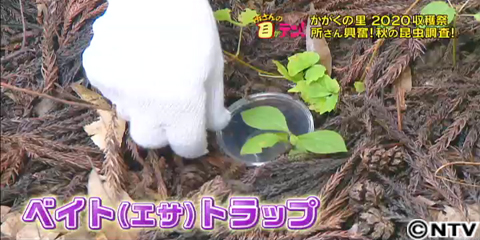 そこには、収穫祭の前日、斉藤先生と阿部さんが裏山に仕掛けた、地表を歩く昆虫をエサでおびき寄せ、落ちたらツルツルのコップを上がれない、ベイト(エサ)トラップというものが。
