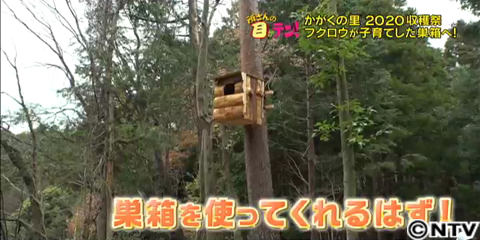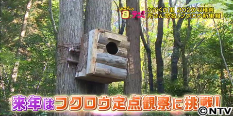 そこで、確率を上げるために、巣箱を2つに増やしました。来年もフクロウが来てくれるよう、新たに設置した巣箱。所さんが考えた名前は?その名も「北北東福福樓壱号店」。さっそく、阿部さんが直筆名前入りプレートを設置!もう1つ、弐号店もとりつけました!来年もフクロウが入れば、今年自粛で出来なかった定点観察に挑戦します!