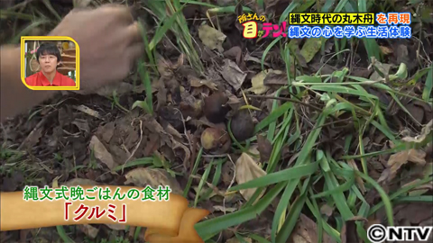 縄文の道具を使いこなすには縄文の心を知る必要がある!ということで縄文生活を体験します。そこで、一緒に晩ご飯の準備を。すると雨宮さん、道で何かを拾い始めました。実はコレは縄文人も食べていたクルミ。