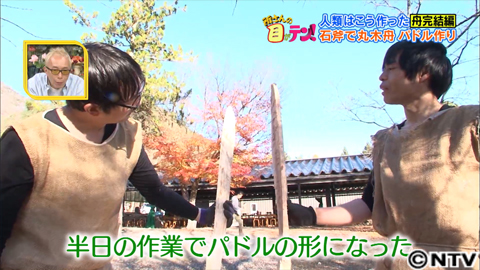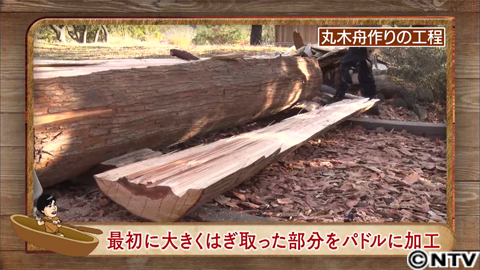 そこで、石斧で同じ年輪のところを切りそろえ、そのささくれを、なめらかにしていきます。技術が必要な難しい作業。宮大工で磨いた腕が光ります。翌日、仕上がった舟を見た2人は、焦る気持ちを抑えパドルを仕上げます。
