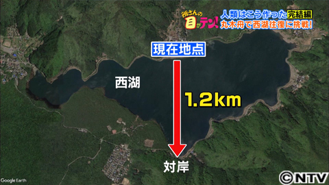 そこで、西湖の対岸を神津島に見立て現在の場所から往復することに!対岸までは直線でおよそ1.2km。往復2.4kmの冒険です。