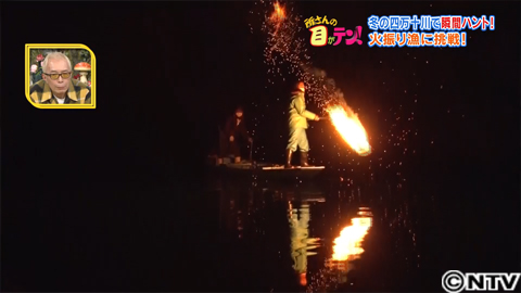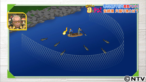 どうやってたいまつを振るのか、まずは、お手本を見せてもらいます。網に近づくと、重さ5キロのたいまつを大きく八の字に振ります。火が消えるまでの10分以上振り続ける体力が必要な伝統漁!