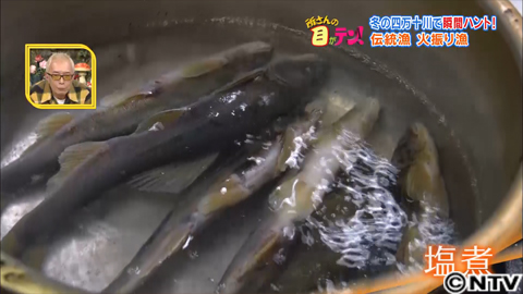 網を引き上げると、ちゃんと鮎がかかっていました。金丸さん、落ち鮎をゲット!そして、金丸さんがとった落ち鮎と岡村さんが前の漁でとったものを調理。塩だけで煮る、塩煮という四万十市ならではの調理方法。