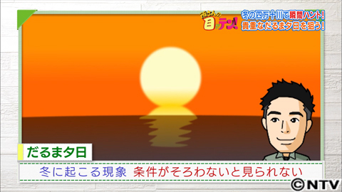 その際、人は、光が来た方にものがあると思い込んでしまうので、太陽が歪んで、だるまのような形に見えるのです。発生条件は、よく晴れた、冷え込みの厳しい冬の日。すべての条件が揃わないと見ることができないとてもレアな現象なんです!