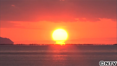 海面上に冷たい空気と暖かい空気の層がある時、太陽の光に屈折が生じます。