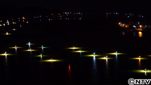 しかし、貴重な瞬間はこれだけではないんです!このシラスウナギ漁の様子を高台から見てみると、漁船が、真っ暗な水面に光を反射させ、幻想的な光景を見せてくれます。