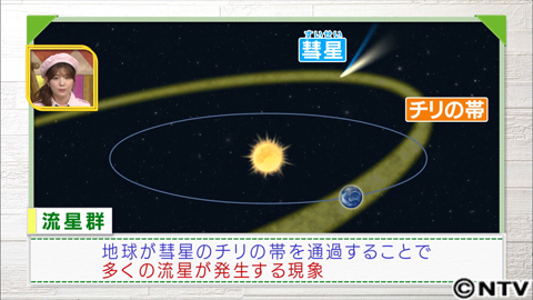 そもそも流星群とは、流れ星が流れてくる方向にある星座の名前が付けられます。今回の場合は、ふたご座の方向から流星がたくさん見られるのでふたご座流星群という名前がついています。地球が、彗星の通り道に残ったチリの帯を通過するとそのチリの粒が大気圏で高温になり発光し、多くの流星が発生します。これが流星群。