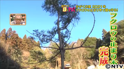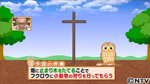 守山先生の作戦は里の畑まで来ているはずのフクロウを利用するもの!イタチなど小動物を捕まえやすいよう、止まり木をたててやれば、フクロウが畑で狩りを行う可能性が上がるそうなんです。