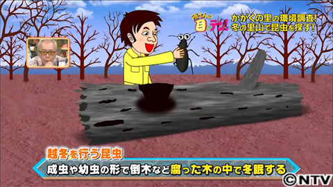 遡ること2日前。阿部さんは冬の昆虫調査のコツを斉藤先生に聞いていました。越冬を行う昆虫は、成虫や幼虫の形で、倒木など腐った木の中で冬眠して春を待ちます。そんな倒木を探し、冬眠中の虫を捕まえる作戦。