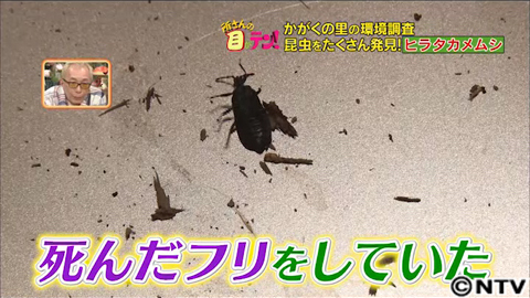 続いては発見してから全く動かないこの昆虫。斉藤先生によると、ヒラタカメムシ。ヒラタカメムシは天敵から逃れるために死んだふりをするのが特徴だそう。そこで捕まえたヒラタカメムシを室内で放置してみると、すぐに触角が動き出しました!そして観察を続けることおよそ5分。やはり死んだフリをしていたようでちゃんと動き出したんです!