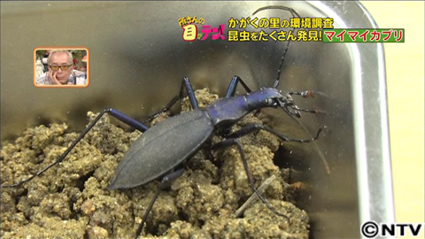 そして3匹目は阿部さんが大興奮したこちらの昆虫!マイマイカブリ!カタツムリを、頭から突っ込んで食べるのでマイマイカブリというそうで、実は日本にしかいない固有種。マイマイカブリはオサムシ類の中でも最大級で、首が長い形がカッコいいということで世界の昆虫ファンや研究者に人気なんだそうです。