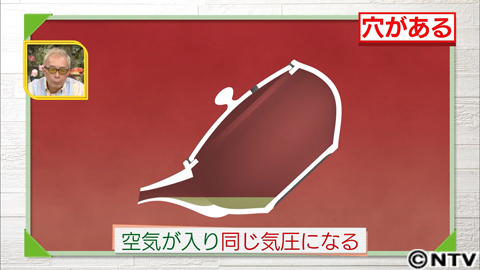 さらに、穴の位置を変えるだけで、出てくるお茶の成分が増えるといいます。空気を取り込む穴を注ぎ口側にすると、お茶のうまみ成分であるアミノ酸や渋み成分カテキンといった物質が、穴を注ぎ口の反対側に持ってきたときより多く抽出されることがお茶メーカーの研究所で成分分析したところ、わかったんです。