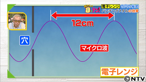 マイクロ波は光と同じ波。波の性質として、波の長さの半分の長さ、4分の1の長さ以下の穴は通りづらいという性質があります。電子レンジで使われているマイクロ波は、この波の長さが12cm程度。