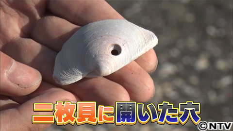 貝に穴をあけた生き物はサキグロタマツメタというツメタガイの仲間。