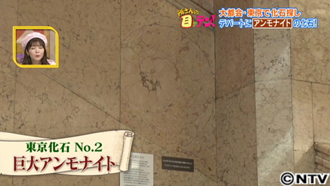 やって来たのは、日本橋三越本店。こんな場所に化石があるのでしょうか?ブティックの真横を通り、中央の階段へ。すると、いきなり壁面にはっきりとアンモナイトの化石が!