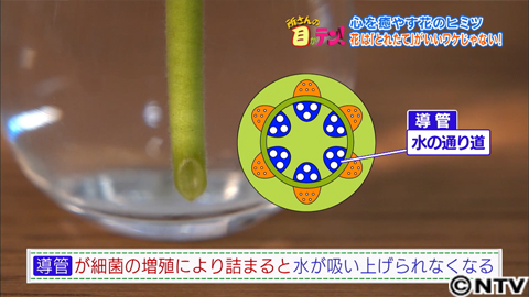 そしてもう一つが、水揚げの悪化。水揚げとは、切り花の水分状態を良くすること。花にとって命ともいえる水が不足すると、首が垂れたり萎れたりしてしまいます。水揚げが悪くなる主な原因は、「細菌による導管の詰まり」。水の通り道である「導管」が、細菌が増えて詰まってしまうと、水が吸い上げられなくなるんです。
