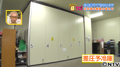 実は、花の日持ちを良くするポイントとして、「温度」も重要。先ほどの農園でも、冷蔵庫の中で吸水させていましたが、温度が高いと、花は呼吸量が増えてエネルギーを使ってしまい、水分も蒸発し、萎れてしまいます。大田市場には、花の温度を下げ、呼吸量を減らすためのあるものがあるんです。それが、花を冷やすための「差圧予冷庫」。