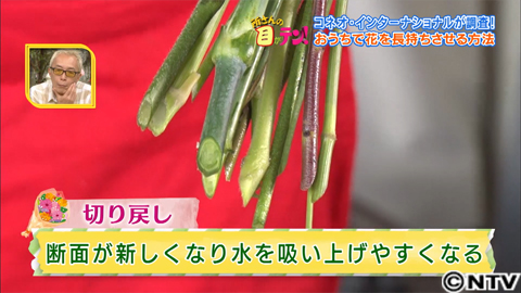 東先生によると、花の茎を水に深く沈ませることで、水圧がかかり、吸水しやすくなるそうです。花を美しく保つ方法、おうちでも、ぜひお試しください。
