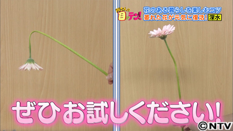 さらに、しおれ始めた花を復活させる方法も。その方法は、「深水」。やり方は簡単。新聞紙などで花を頭ごと、くるくると巻きます。吸収した水分が葉から蒸発しないようにするためです。次に茎の根本を切り、断面を新しくします。最後に、水をたっぷり入れた容器に花をまっすぐ立てます。花びらの部分が濡れない程度の水に深くつけ、数時間から一晩置くんです。実際に、しおれてふにゃふにゃになった花に深水をしてみたところ、7時間後にはしゃきっと元気になったんです!