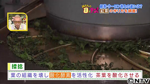 目の前に茶畑が広がりますが、実は、「紅茶の木」という種類があるわけではなく緑茶もウーロン茶も紅茶も、元は同じツバキ科の「チャノキ」の葉からできています。岡部さんによると、紅茶と他のお茶との違いは「発酵度」。一体どういうことでしょうか?その秘密を探るため、製造の様子を見せてもらいます。