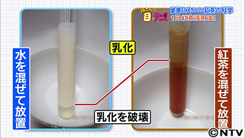 マヨネーズに水を混ぜて放置したものと、紅茶を混ぜて放置したものを見てみると、水に比べて、紅茶の方はより多くの分離が確認できたんです。