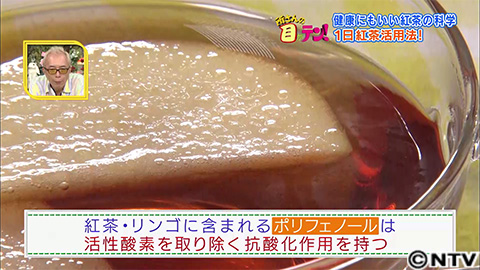 仕事で疲れた午後のひと時にも紅茶。大森先生のおすすめが、紅茶にリンゴを入れること。紅茶やリンゴに含まれるポリフェノールには、人の体を老化させる「活性酸素」を取り除く“抗酸化作用”があるんです。リンゴ紅茶ならおいしく、より多くのポリフェノールを取り入れられます!