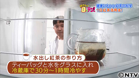 夜も更け、そろそろ寝る時間。実は夜にも紅茶はおすすめなんです。それは、普通の紅茶ではなく、水出しの紅茶。カフェインは冷水に溶けにくい性質のため、水で淹れれば、リラックス効果のあるテアニンの量はそのままに、カフェインは少ない紅茶になるんだそう。作り方は、ティーバッグと水をグラスに入れ、冷蔵庫で30分~1時間冷やすだけ。夜カフェインを取ると眠れなくなる方にもおすすめなんです!