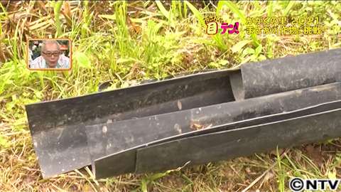自然薯栽培には、色々な道具を使うんだそうで、まずは筒状のシート。この中で自然薯が長~く伸びていくといいます。自然では、真下に伸びる自然薯をこの筒で、横へと伸ばし、楽に収穫できるようにするんです。