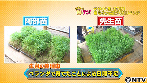 そして6月、田植えの日。2つの苗を見比べてみると阿部さんの苗は貧弱で枯れかけたものも!理由は、ベランダの日当たりが悪く、日照不足だったこと。さらに阿部さんが1日だけ水やりをサボったことで一気に枯れてしまったとのことです。