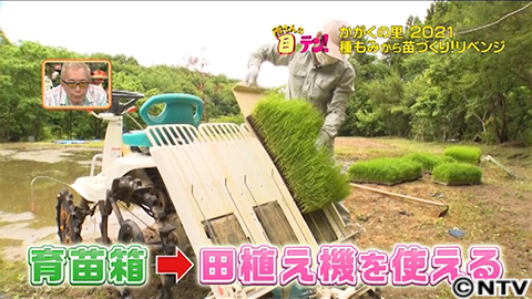 それに育苗箱で育てれば、田植え機が使える!ということで、育苗箱に土を入れ、西野さんが持ってきた昔ながらの道具で均等に種まき!その上に土をかぶせ、育苗箱を苗代へ!最後にシートをかぶせて保温すれば!完成です。