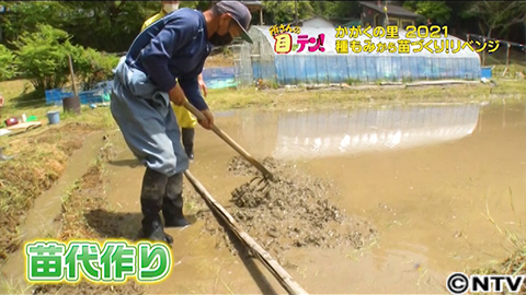 いよいよ、ここからが初挑戦!苗代を西野さん指導の下、田んぼに作ります。田んぼの泥を盛って小高くし、種もみが芽を出せて、かつ水が行きわたる高さに!でも実は、ここに種もみをまくのではないそう。使うのは、育苗箱。実は、育苗箱の底には穴が空いていて、苗代に箱ごと置けば、水は浸透してきます。