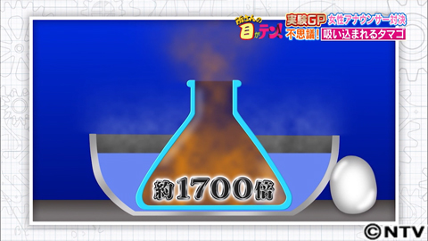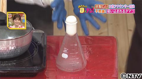 そこで用意したのは、鍋と沸騰したお湯。まずは鍋から出てくる湯気をフラスコの中に入れます。そして、湯気を入れて5、4、3、2、1、フラスコの口に卵を置くと…なんと卵がポンっとフラスコの中に入っていきました。