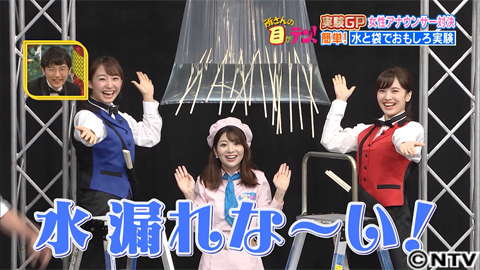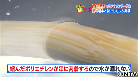 用意したのは、水が入っているビニール袋。佐藤アナが水袋の下に立たされ、なんと、この水の入った袋に木の串を刺して行くといいます。そして、木の串を一本、二本と、どんどん水袋に刺していきます。しかし、水が漏れてくる様子はありません。