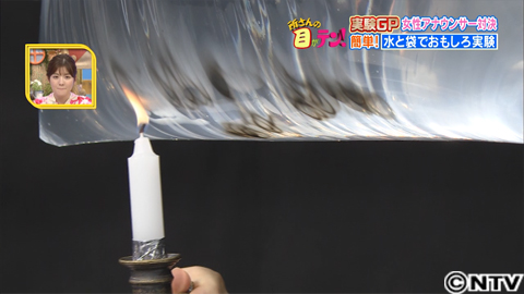 さらに、袋と水で、もうひと実験。水の入った袋を2つ用意。そして、所さんが左側の水袋の下に。もう一つの水袋の下には裕太さんに座ってもらいます。そして袋の下からロウソクで炙ります!さあ、どうなるでしょうか?