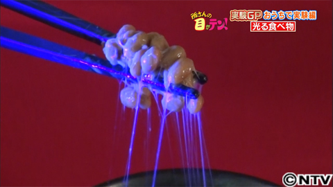 オムライスにあてていたブラックライトは、紫外線を放つ照明で、ホームセンターなどで 手に入ります。紫外線を蛍光の色素を持つものに当てると鮮やかな光を放ちます。実はこの蛍光色素は、人体に不可欠なある栄養素にも含まれているんです。それがビタミンB2。エネルギー代謝に深く関わっている栄養素なんです。先ほどのオムライスの文字は、このビタミンB2の錠剤を溶かした水溶液で書かれたものです。だから、紫外線を当てると文字が光ったんです。ビタミンB2は身近な食材だと納豆に含まれており、紫外線を当てると、糸の部分が光りますよ!