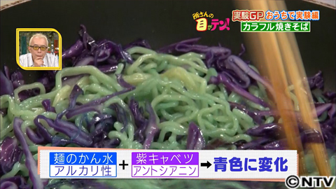 これは、焼きそばの麺の中にかん水というものが入っているから。かん水はアルカリ性の性質を持っており、そこに紫キャベツの中に含まれているアントシアニンという色素が入ると、アルカリ性と反応して青色に変わるという性質を持っているので、焼きそばの麺が色鮮やかな青色に変化したんです。