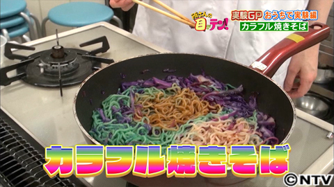 ここにソースを入れると青い色が消え、ソースの色に。これは、ソースが酸性なので、アルカリ性が中和され元の麺の色に戻ったんです。さらにお酢を入れると、今度はお酢のより強い酸性によって、紫キャベツのアントシアニンが反応しピンク色に。カラフル焼きそばが出来上がり!美味しくておしゃれな実験でした!