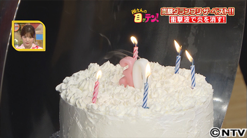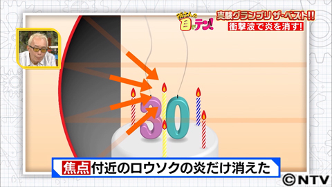 なんと、片方の中華鍋に向かってピストルを打ち込み、衝撃波で3と0の数字のろうそくだけ消すというんです!早速、ロウソクに火をつけスタンバイ完了。そして、ピストルを撃つと、ケーキの3と0のロウソクだけ消えました!いったいどうして?