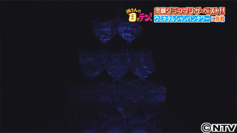 実は注いだのはシャンパンではなく、キンキンに冷やした海水。それぞれのグラスにウミホタルを入れておいて、海水をかけると急に温度が変わる刺激によって光だしたということ。このウミホタルシャンパンタワー、先生は教え子の結婚式でも実際に披露したそうです。