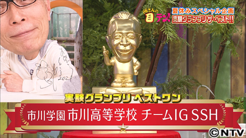 最後に所さんが選んだベストワンは、衝撃波で炎を消す!所さんサイン入りポスターと所さん像は、市川学園市川高等学校チームIGSSHの皆さんに、責任をもってお届けします。