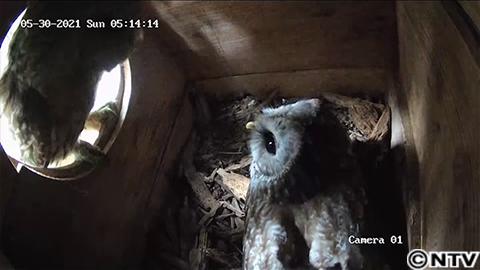 そして4月。前回、撮影に成功した日から2ヶ月半後、同じ巣箱につがいのフクロウが戻ってきたんです!さらに5月、明け方5時の映像にもフクロウが!陽が出ている時に撮影できたのは初めてです。フクロウは夜行性のため、エサを取るなどの活動は夜。朝方に見られたフクロウは狩りを終えた後に巣箱の様子を覗きに来たのかもしれません。