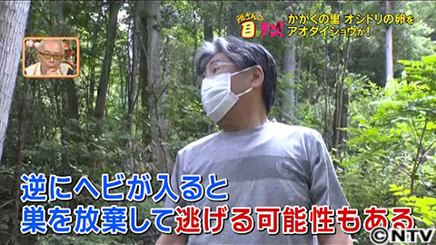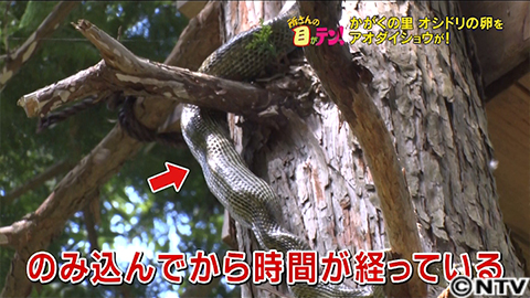 なんとオシドリが入った巣箱に大きなヘビが!本州では最大の大きさになるアオダイショウ、最大全長2メートルになります。なんと、アオダイショウがオシドリの巣を襲い、卵を食べた直後のようです!お腹は確かに卵型に膨らんでいます。予想もしなかった出来事。