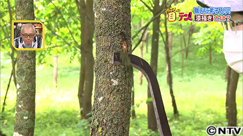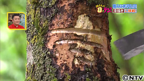 ということで、コネオさんも早速、挑戦!漆は皮膚につくとかぶれてしまうため、完全防備で行います!まずは、樹皮を剥がし、傷をつけていきます。しかしコネオさん、深く傷をつけ漆が蓄えられている部分を削り取ってしまいました。国産の漆は、職人たちの卓越した技術で集められた貴重なものだったんです!