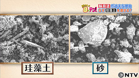 漆の研究を行う金沢工業大学の小川俊夫先生に聞くと、砂のような下地は粒子が大きいため、漆との接着面積が小さくなります。一方、珪藻土の場合は、小さな穴が空いているため、そこに漆が入って、珪藻土と漆の接着がよくなります。そのため剥がれにくい、つまり壊れにくく丈夫になるというのです。珪藻土と砂を比べてみると、確かに粒子が小さく、珪藻土の方が細かい穴が空いていることがわかります。この微細な穴に、漆が入ることでより強固な漆器になるのです。