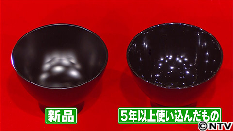 ちなみに、新品の輪島塗と使いこんだ輪島塗には、見た目にも違いが出てくるんです。新品の方は、表面がまだ凸凹していて、光は乱反射するので、目に入ってくる光が分散されて、少し光沢が抑えられたマットな質感に見えるんです。しかし、使い込んでいくと、表面が滑らかになり、強く反射された光が目に入るので、つやのある光沢に見えるんです。