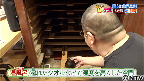 早速、コネオさんも挑戦!まずは、箸を塗ってきます。塗り終えたら、布できれいに拭いていきます。続いて、スプーン、お椀も漆を塗って、布で拭いていきます。そして、一晩置いて、漆を乾燥させるのですが、乾燥させる場所は、なんと湿度は74パーセント!乾燥させるのに、湿度が高いってどういうこと?実は、漆の乾燥には、水分が必要なんです!