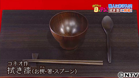 スタジオには、コネオさんが作った漆器が登場。コネオさんの作った拭き漆の漆器ですが、職人さんが、完成品を見て「十分売り物になる」とおっしゃっていました!